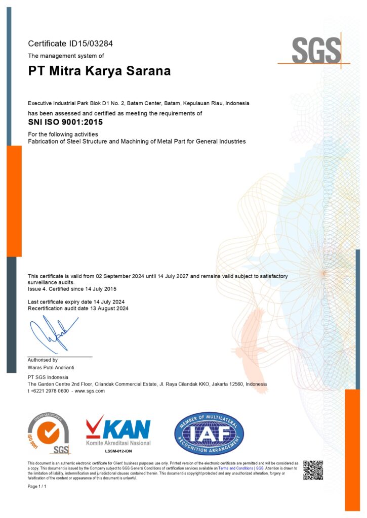 PT Mitra Karya Sarana (PT MKS), Specializing in Steel Fabrication, Machining, Marine Contractor, Civil Construction and Engineering Services, has been providing reliable and high-quality engineering solutions since 2006. Located in Batam, Indonesia, we serve a wide range of industrial, marine, and infrastructure projects, combining advanced technology with experienced expertise to ensure project success, client satisfaction, and sustainable partnerships.